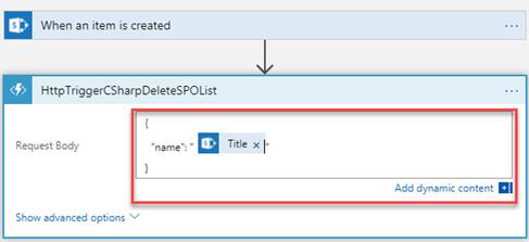 In this article, you will see how to call Azure Functions in Logic Apps. I have created a custom list named “List Info” with “Title” field. Title field will contain the list name which will be deleted by the Azure Functions. I have already created an Azure function to delete SharePoint list. When a new item is created in List Info, Logic App will get triggered and execute the Azure function which will get the list name from the “List Info” list Title field and delete the respective list.