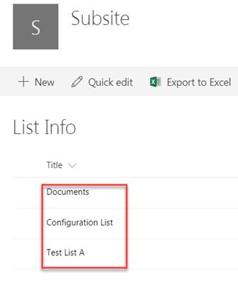 The list names mentioned in the newly created items in “List info” will be deleted. Example: Documents, Configuration List & Test List A will be deleted from the site.