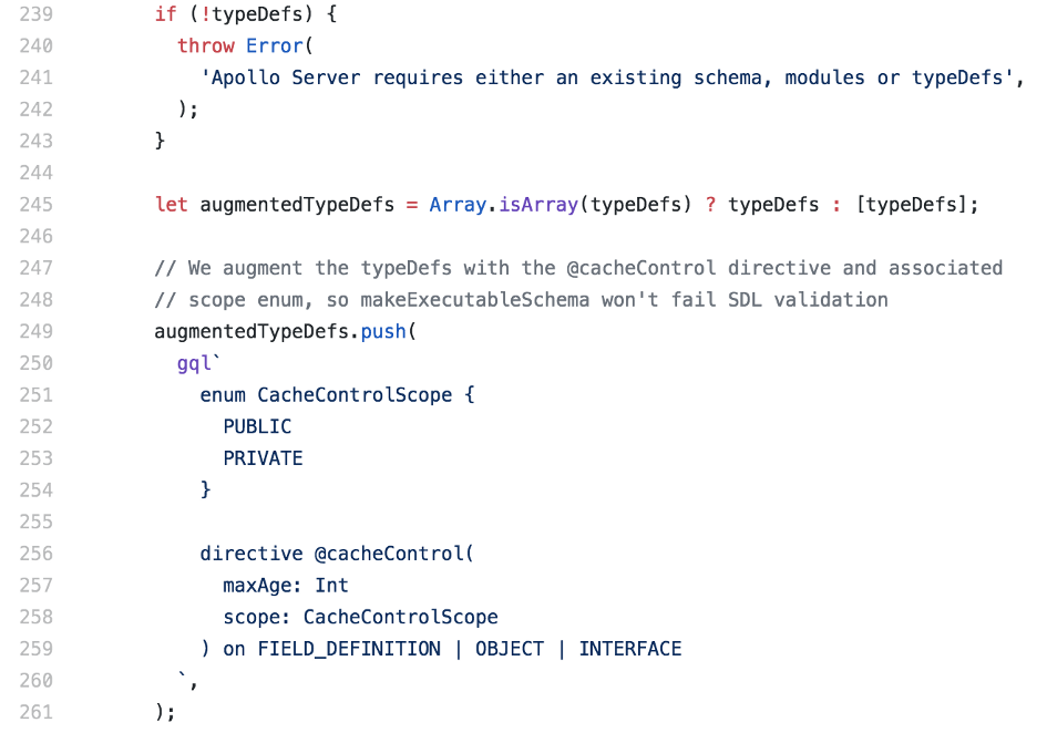 Lastly, I was curious as to how and why the typeDef key in the ApolloServer constructor could accept both a single typeDef file AND an array of typeDefs.The Apollo Server docs state that you can pass the typeDef key a DocumentNode or an Array of Document Nodes but I simply wanted to understand how this functions under the hood. To get to the bottom of this question, I jumped into the Apollo Server source code.