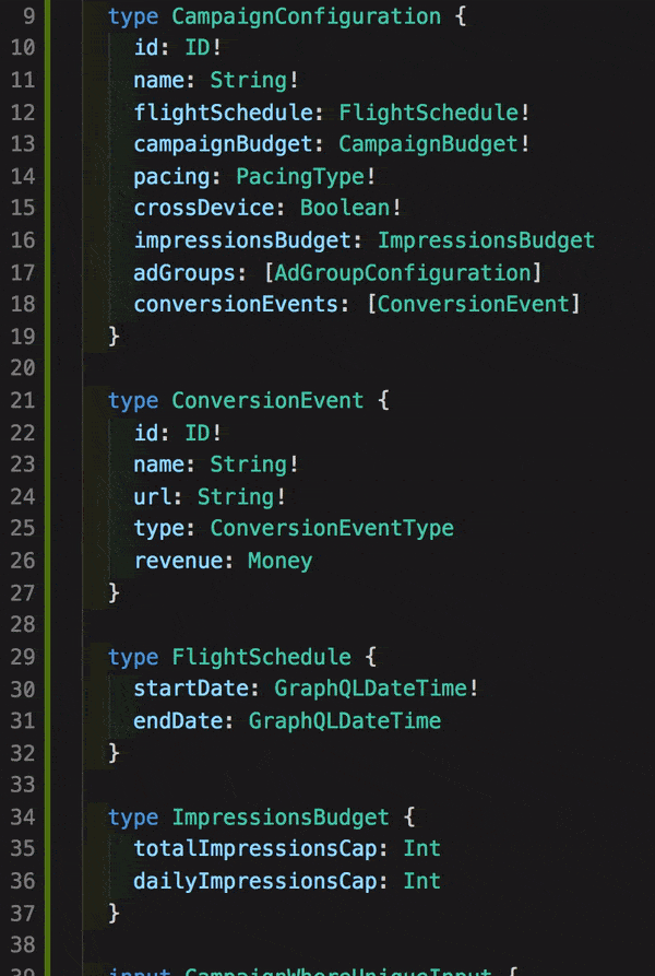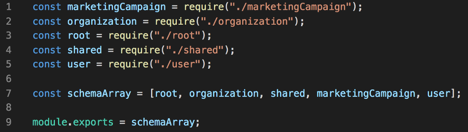 Organizations, Users, and Marketing Campaigns are the first important resources that I needed to define the types of so it made since to split them off into their own files. Shared will hold common types to be used across domains (such as date-times and currency) and I will use the Root file to start a base Mutation and Query to extend in all of the other files will all be accessible on the top level Mutation and Query key.
