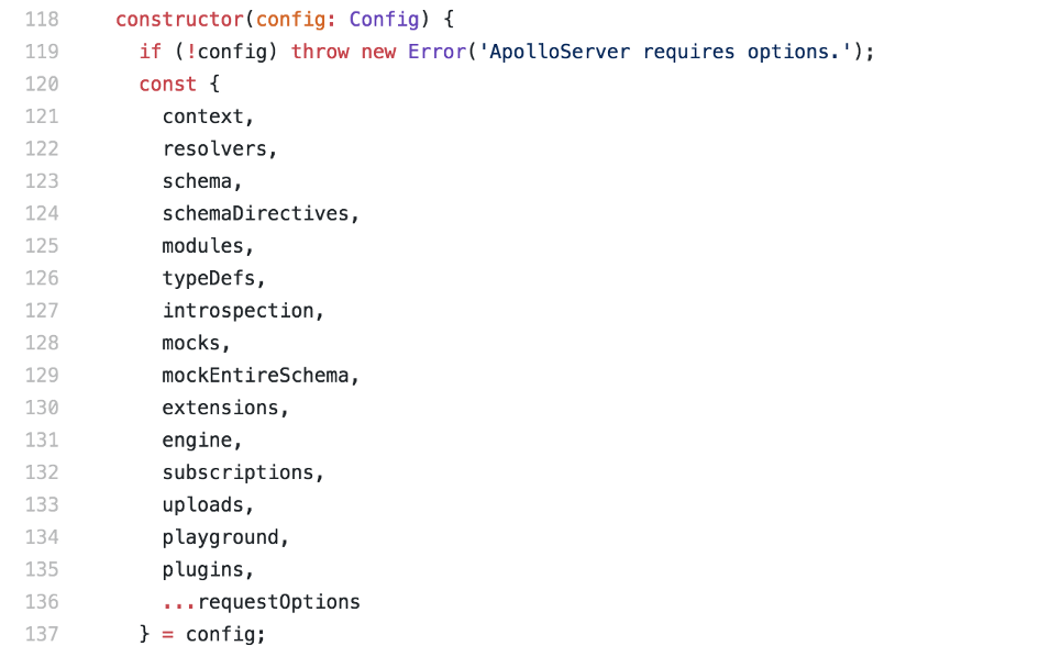 The code I’m referencing in the following example is pulled from the apollo-server repo version 2.3.1 (so there is a good chance that it may have changed if you are looking at this in the future). After some digging, I located the file that we are interested in apollo-server/packages/apollo-server-core/src/ApolloServer.ts. This file exports the ApolloServerBase class which defines the core behavior of ApolloServer which is then extended and optimized for the target framework (express, koa, connect, hapi).