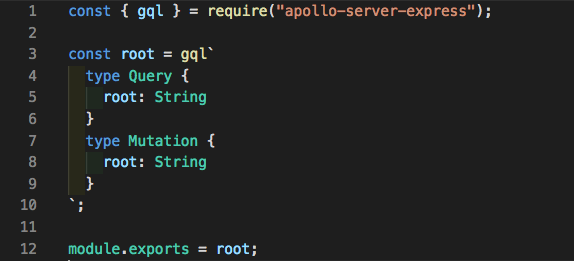 This root Mutation and Query only serve on purpose — to be extended on by the Queries and Mutations in my other files. It’s a current limitation of Apollo-Server that these “base” types require having a Query or Mutation on them. If I remove line 5 and try to create an empty Query type to extend later on, Apollo will throw a syntax error. I’ve read that they will be fixing or improving this functionality in the future so stay tuned for that!