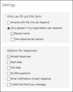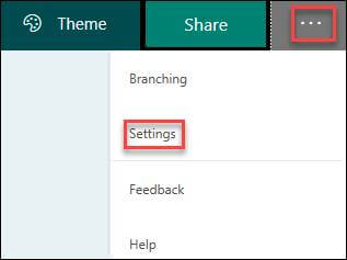 Open the form and click “...” at the top right corner. Click Settings. It has the following options.
