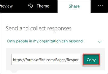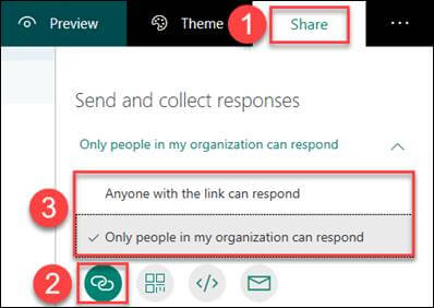Click Share at the top right corner to share the form with others so as to collect the response. A form can be shared as a link, via an email, via a QR code, and via an embedded code in your web page or sway.