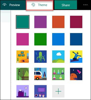 Click "Theme" at the top right corner to change the theme of the form. Several built-in themes are available and in addition, Microsoft Forms allows users to add custom themes.