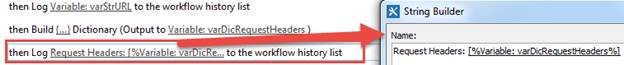 Log varDicRequestHeaders variable value to the Workflow history list.