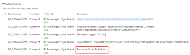 When you try to call HTTP Web Service to create list (HTTP POST), you will get the response code as forbidden or unauthorized as shown below. You will get the error, when you try to access the objects in SharePoint, that requires the elevated permissions.