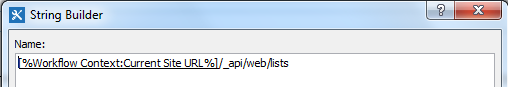 Set Workflow Variable Action – Set the Workflow variable varStrURL to http://sitename/_api/web/lists,