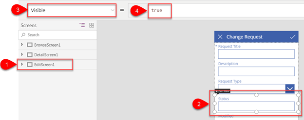 Navigate to the Edit screen, select Status card and then select Visible property in the property box. Set visible property value to false in the formula bar so that Status field will not be shown to users in edit/new form.