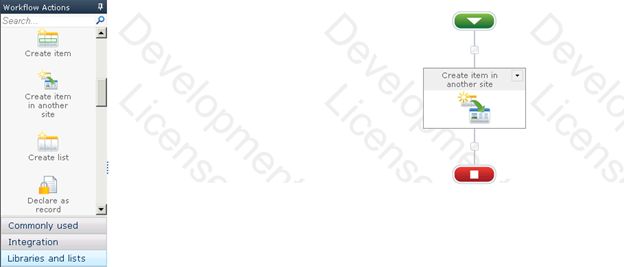Drag and drop the "Create item in another site" action from the Libraries and lists section.