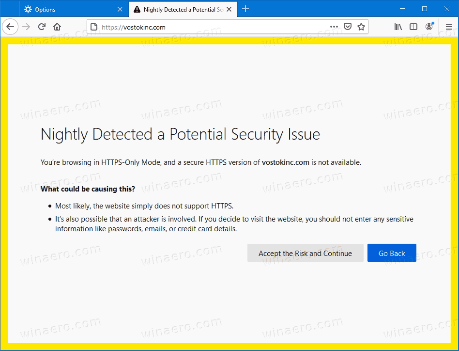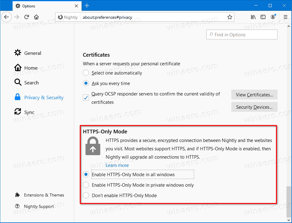 Mozilla has introduced a new option in the Nightly version of the browser. When enabled, it only allows opening websites over the HTTPS, refusing connections to the plain unencrypted HTTP.