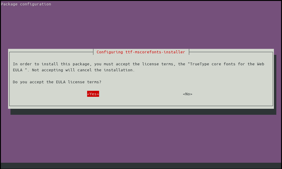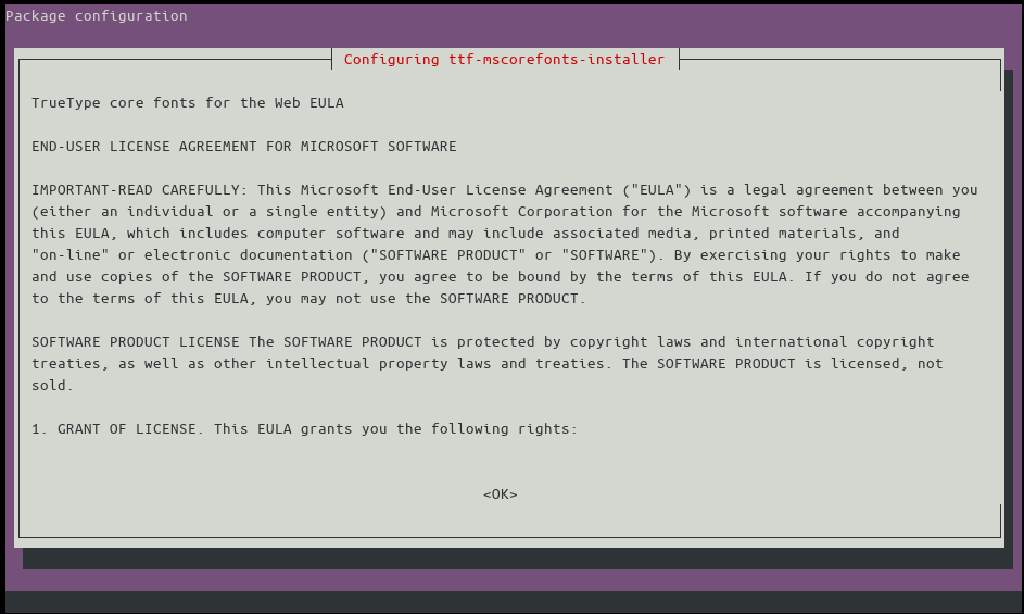 sudo apt install ttf-mscorefonts-installerAfter the initial download, a set of license terms will appear in your terminal window. Acknowledge the install prompt by tabbing to the “OK” button and pressing enter; repeat on the next screen to select the “Yes” button and accept the EULA.