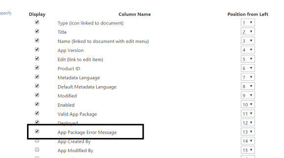 The invalid app will not be listed under contents page (add an app section) for installing. To identify the error, the apps for SharePoint list provides the extra field to list down the errors. In the apps for SharePoint list under app catalog site, modify the view, using library tab. Include App Package Error Message column in the view.