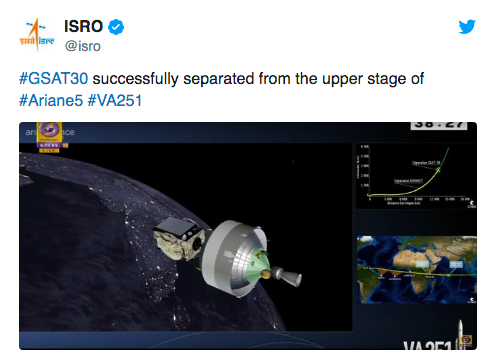 After a flight lasting a little more than 38 minutes, the GSAT-30 separated from the Ariane 5 upper stage in an elliptical Geosynchronous Transfer Orbit.