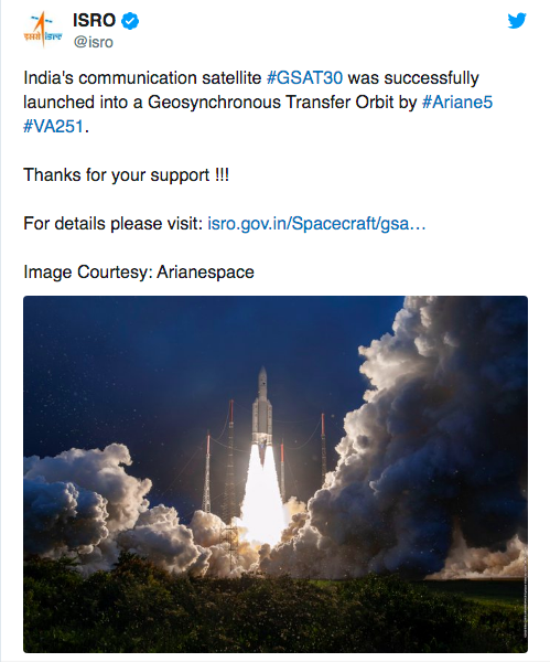 India’s latest communications satellite, GSAT-30, to enhance television, telecommunications and broadcasting services was launched successfully by the European commercial launcher Arianespace early on Friday.