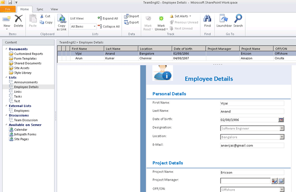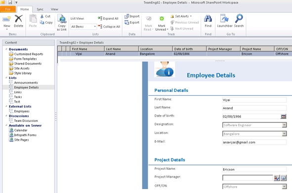 SharePoint workspaces enable you to automatically synchronize lists from SharePoint Server 2010. I have customized the list forms with InfoPath forms, SharePoint Workspace automatically downloads those forms. The InfoPath form that is downloaded in the SharePoint workspace will contains all of the fields and features available from the SharePoint list. If the forms are subsequently updated on the server, SharePoint Workspace will synchronize the latest versions of those forms as well. I have a custom List named Employee Details which contains the following columns