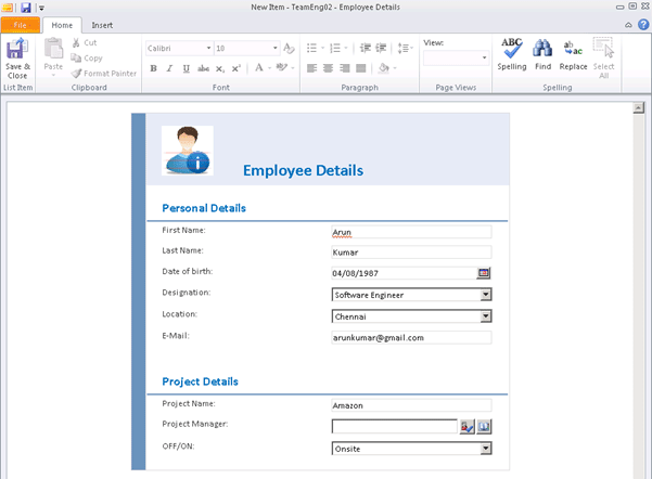 When you click an item, the item details will be displayed in the InfoPath form as shown in the figure