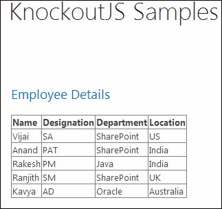 self.Employees = ko.observableArray([]); self.AddEmployees = function (name, designation, department, location)