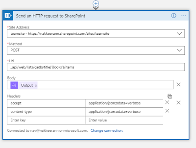Send HTTP request to SharePoint action is used to create the data on SharePoint list. The input could be the JSON data transformed above. (This could have been done by simply choosing create item action. But for our requirement scenario, we have chosen the REST endpoint request action)