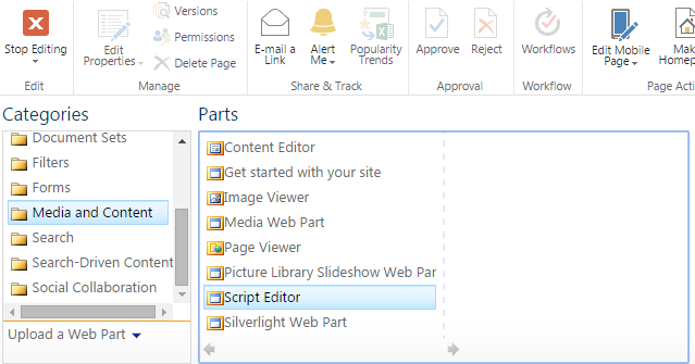 Choose Script Editor, under the Media and Content Web part.