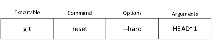 The executable command is git, the sub-command is reset, the option used is --head, and the argument is HEAD~1.