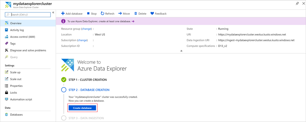 Azure Data Explorer is a fast and highly scalable data exploration service for log and telemetry data. To use Azure Data Explorer, you first create a cluster, and create one or more databases in that cluster. Then you ingest (load) data into a database so that you can run queries against it. In this quick-start, you create a cluster and a database.