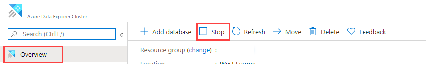 To stop the cluster, at the top of the Overview tab, select Stop.