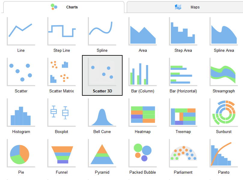Here you can play around with data visualization and see how to points are related to each other. There are a plethora of visualization types available as shown below.