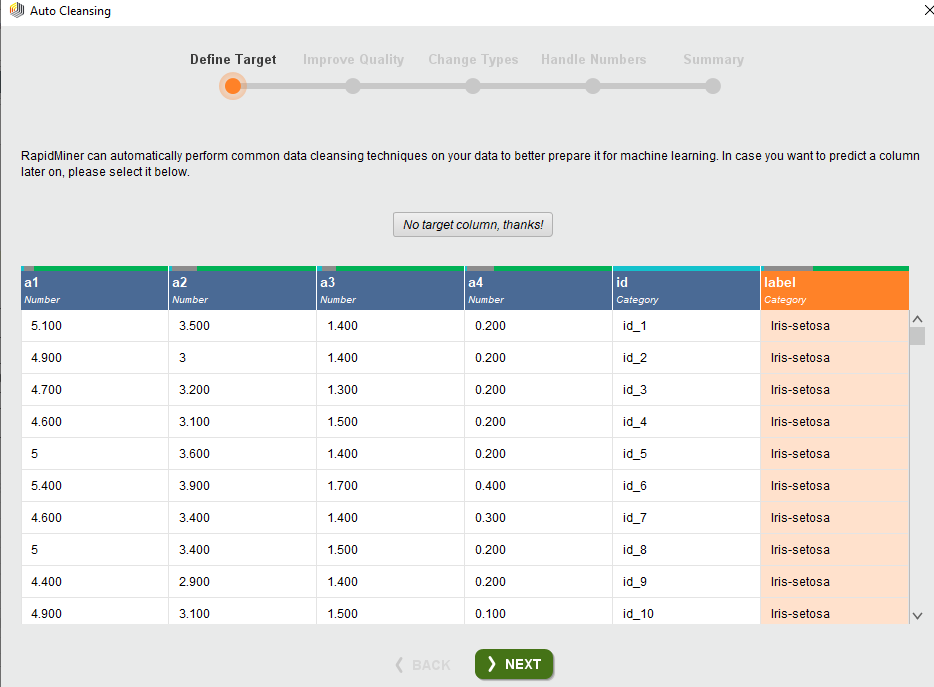 Another suitable option is the cleanse option. The cleanse option automatically understands and cleans your dataset for you. The auto cleanses option first asks you to select the target column.