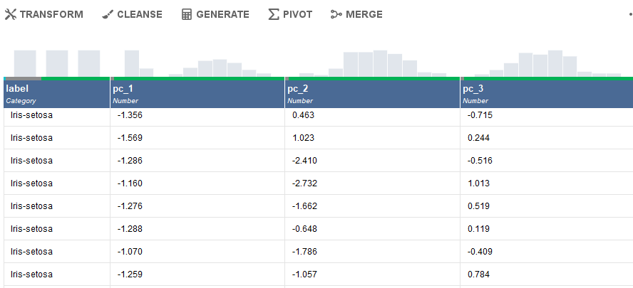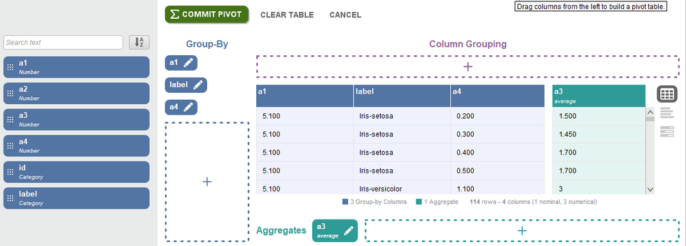 As you can see there are few options to perform the data processing. You can transform the data, clean it, generate new data, analyse the statistics using Pivot or merge the columns together. Let us explore these options now. The pivot option helps in performing statistical analysis. You can drag and drop columns to group them with the target.