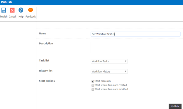 Start Options: 1. You can either start your workflow manually. 2. Or you can start your workflow automatically when an item is created 3. Or you can start your workflow automatically when an item is modified.