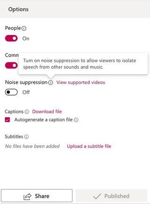 It’s a noisy world and not every video is produced in a nice studio – often onsite and unable to get everything quiet. Noise suppression, when turned on by video owners, allows viewers to isolate speech from other sounds and music during playback. Noise suppression can be switched on or off for each newly uploaded video.