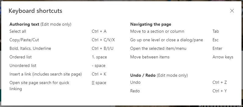 Much of Windows and Microsoft 365 is navigable via keyboard, and this month, SharePoint pages joined in. This month we released a way to see all the pages keyboard shortcuts you can take advantage of when authoring text, navigating the page or performing undo/redo. Just click Shift + ? when in page edit mode to bring up a list of available keyboard shortcuts. I’m particularly fond of Ctrl + K and Tab – huge time savers.