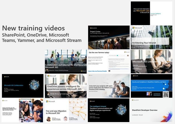 This series of 14 training videos covers the value and recent updates across SharePoint, OneDrive, Microsoft Lists, Microsoft Teams, Project Cortex, Yammer, and Stream - including information for employees, admins, and developers - all in the context of scenarios supported within Microsoft 365 across teamwork and employee engagement - all in one blog post for you to consume at your leisure.