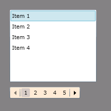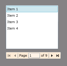 <Canvas Height="230" Width="230" Background="Gray"> <ListBox x:Name="listBox" Height="150" Width="180" Canvas.Left="20" Canvas.Top="20" /> <sdk:DataPager x:Name="dataPager" Background="AntiqueWhite" Canvas.Left="20" Canvas.Top="180" PageSize="4"