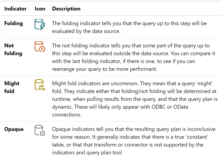 Conversely, this can also mean that your query folds up to a point and then stops folding. Unlike in the case where you have a folding indicator for the step, which shows that everything folds, when you have a not folding indicator it doesn’t mean that everything doesn’t fold – instead, it means that “not everything” folds. Generally, everything up to the last folding indicator will fold, with additional operations happening after.