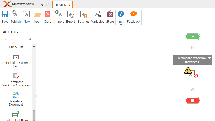Add the action, “Terminate Workflow Instances” either by right click on the workflow or by dragging and dropping from the left toolbox.