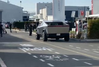 In the images sent to Teslarati, Elon Musk can be seen inspecting the rear of the Cybertruck and its motorized rear tonneau, as film crew busily prepared equipment for the camera truck that would follow the stainless steel pickup past SpaceX.