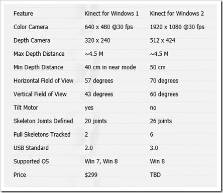 A great comparison chart of the difference between the two Kinects. The only missing thing is that both Kinects now are fully working on Windows 10 (Image by Zugara)