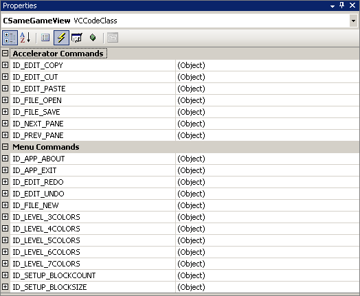When you click on a menu option the program fires an event indicating which menu option was selected. We just need to catch that event with an event handler. It is very similar to the event handlers that we discussed and used in the previous article. Really the only difference is where we find the events for the menu options. We start from the properties window of the CSameGameView and click on the "Events" button (lightning bolt). Once you click on that you'll see the following.