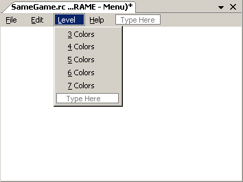 Adding a new menu is as simple as clicking on the "Type Here" at the top in the menu bar. Type in "&Level" to add the Level menu. After hitting Enter you can move the menu to the left of the Help menu by just clicking on the menu and dragging it to the left. Now let's add in the menu options. We want to allow the user to select different levels from three to seven colors. Add in the following five menu options seen below. The first one contains the text "&3 Colors" and so on.