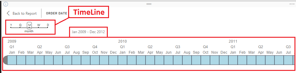 Now, let’s analyze TimeLine Slicer Visual. On the top of a visual, it is showing the option to select Time Line.