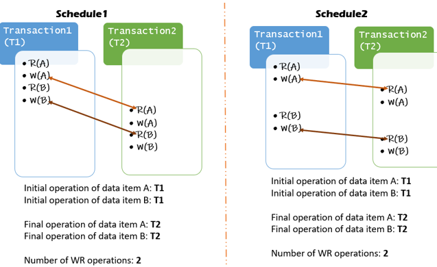 If two schedules display the same result after execution, it is called result equivalent schedule. They may offer the same result for some value and different results for another set of values. For example, one transaction updates the product quantity, while other updates customer details.
