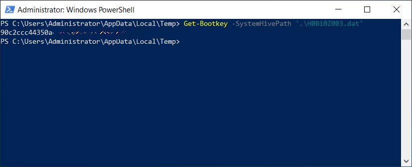 Using the DSInternals PowerShell modules we can easily extract the BootKey decryption key from the System hive using the "Get-Bootkey -SystemHivePath '.\H00i0Z003.dat'" command.