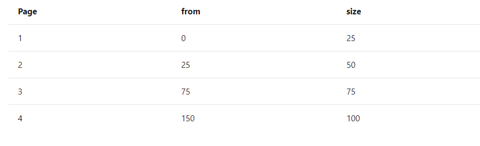 Paginate subsequent pages by updating the from and size properties. You can increase the page size in each subsequent request. The following table shows an example.