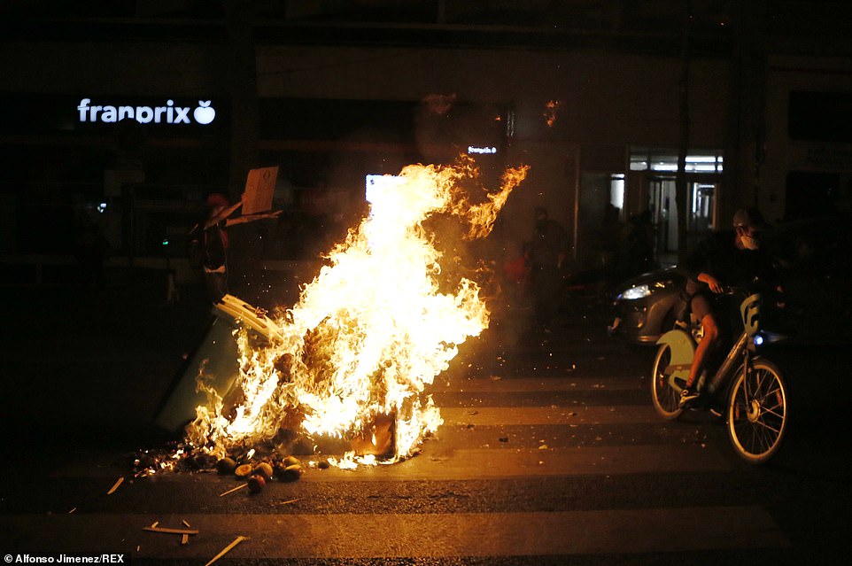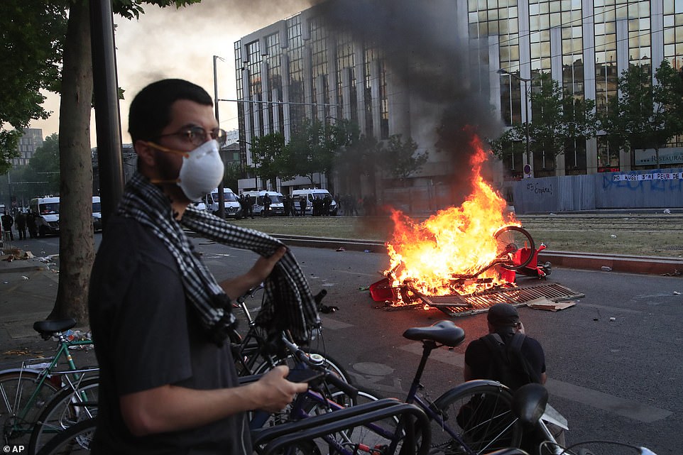 A bonfire burns on the streets of Paris last night after thousands took to the streets over the death of Traore in 2016, which has become a symbol of police brutality against black people, like Floyd in the United States