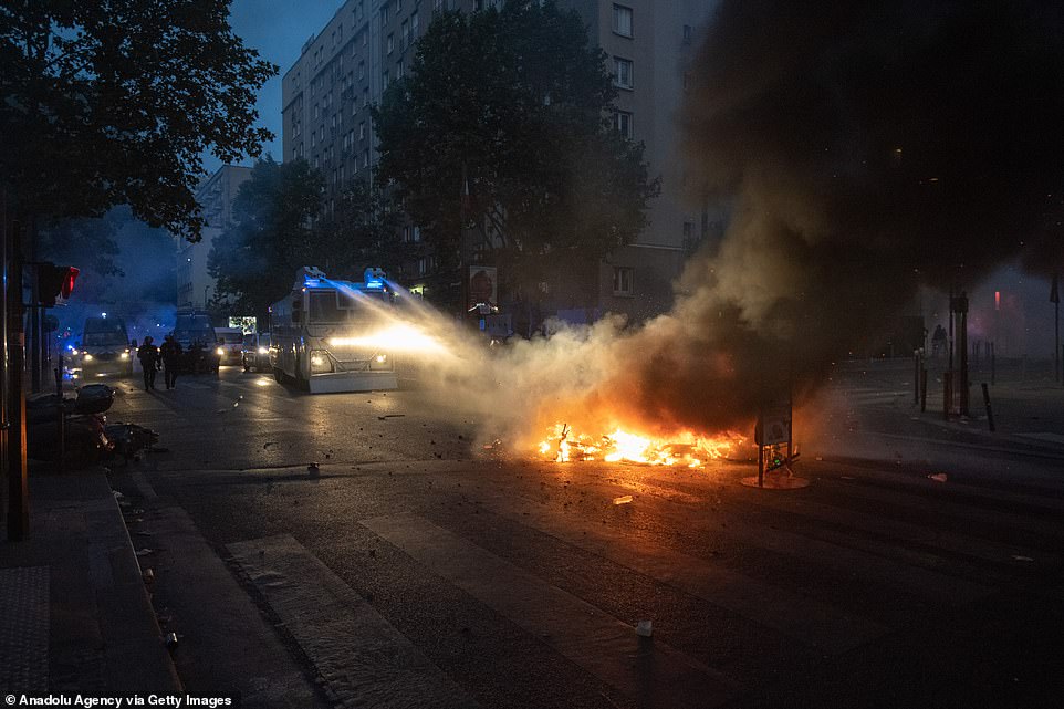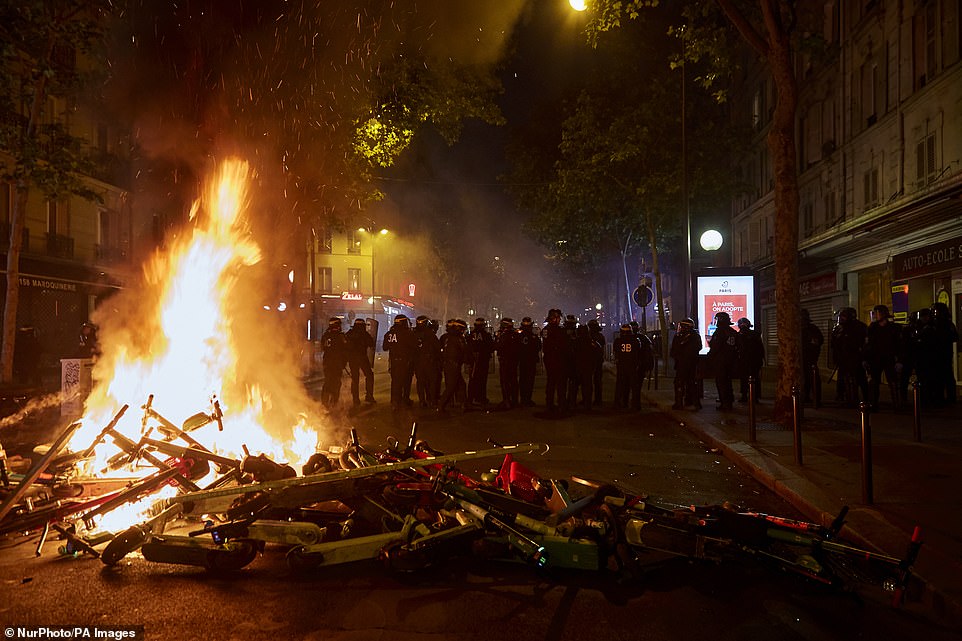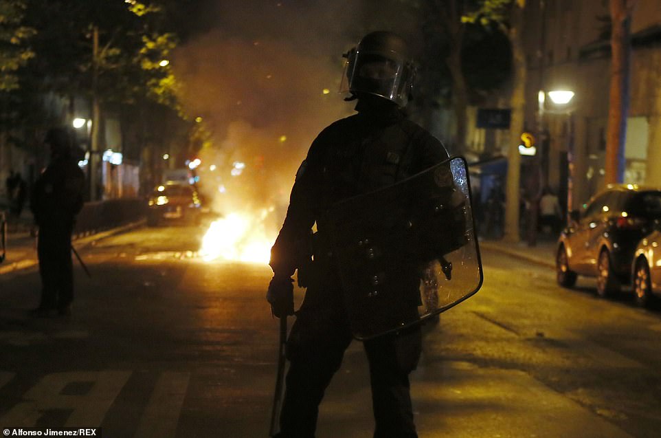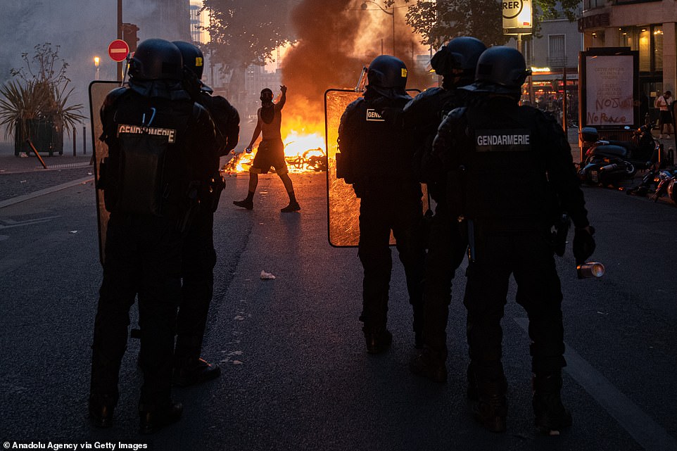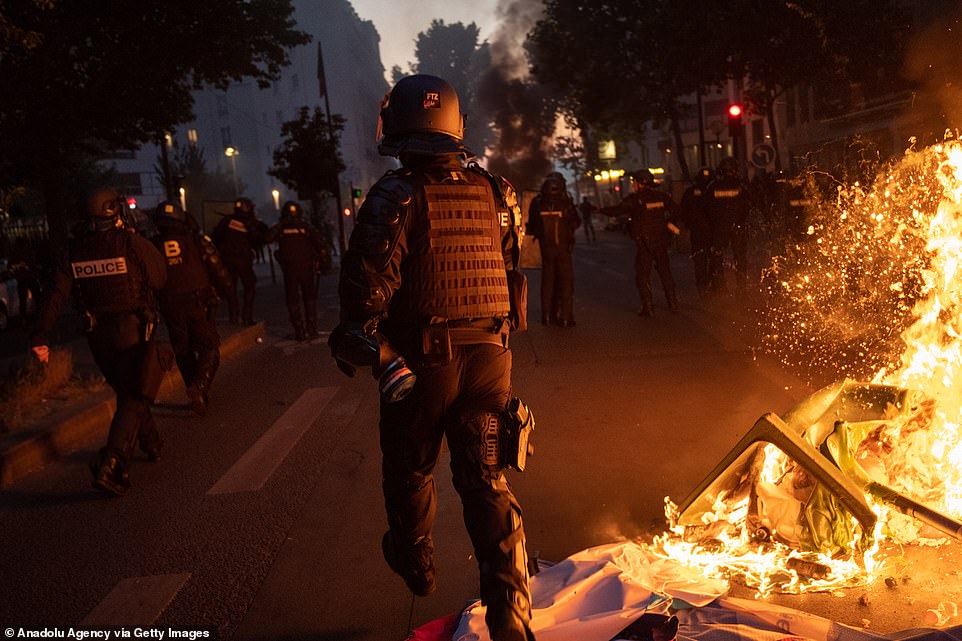 Heavily armoured officers guard the streets of Paris last night as a bonfire burns in the street after protests over police brutality