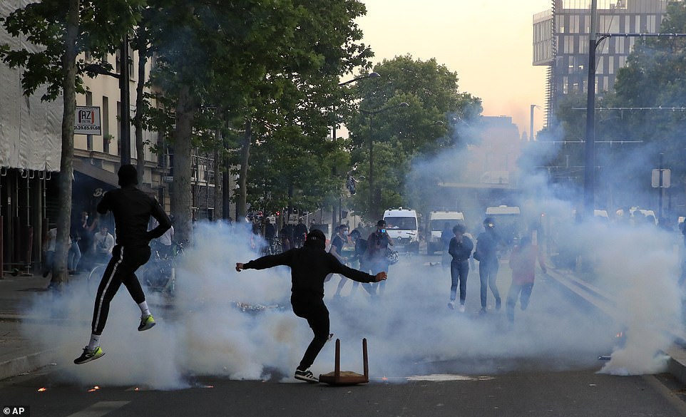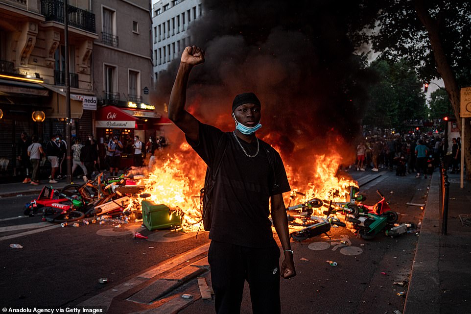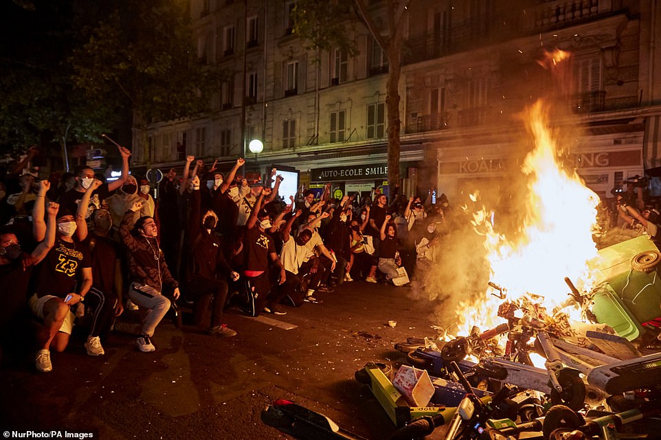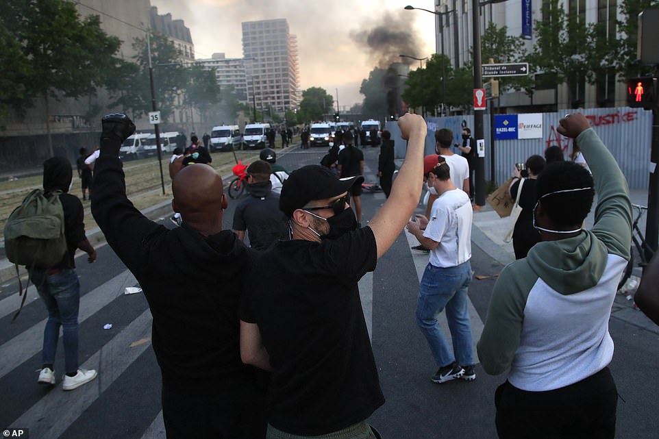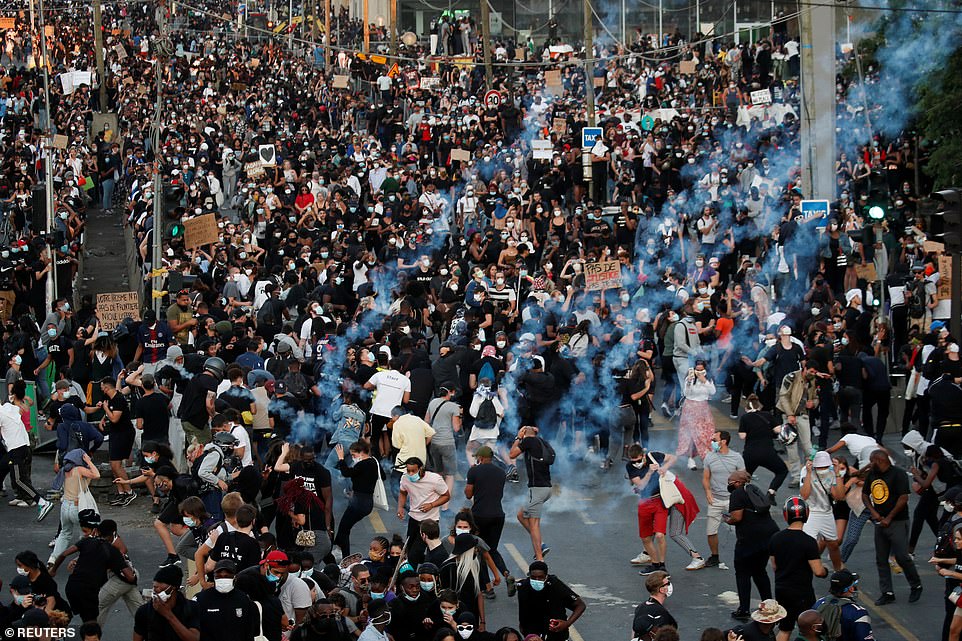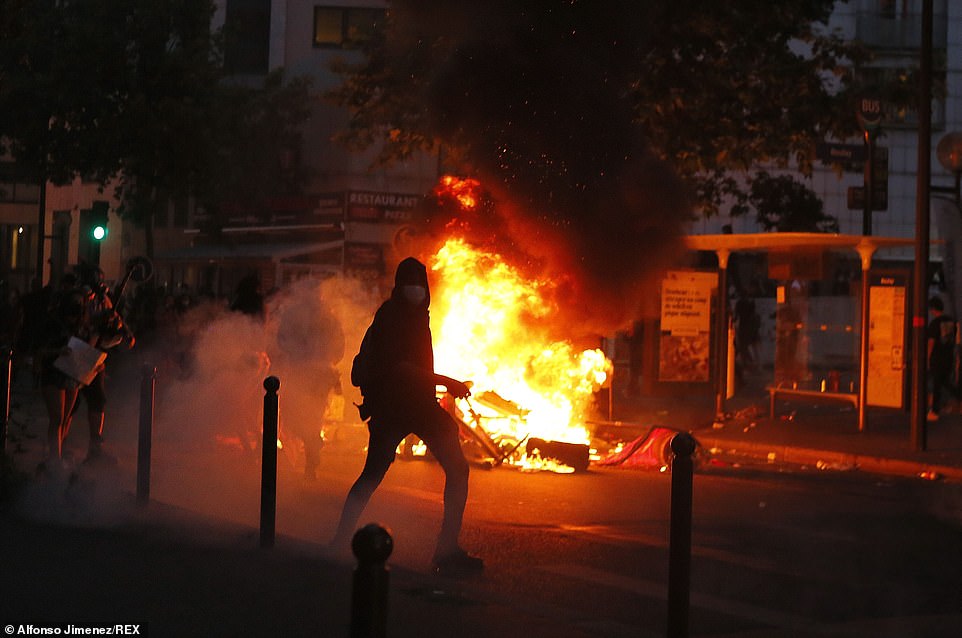 Some 20,000 protesters last night rallied in Paris to demonstrate against the 2016 death of a young black man in French police custody, mirroring the slogans and symbols used in the George Floyd riots in the US. The protest rapidly descended into rioting, with bonfires lit in the street outside the Tribunal de Paris courthouse before police officers fired tear gas and rubber bullets at the barricaded demonstrators.