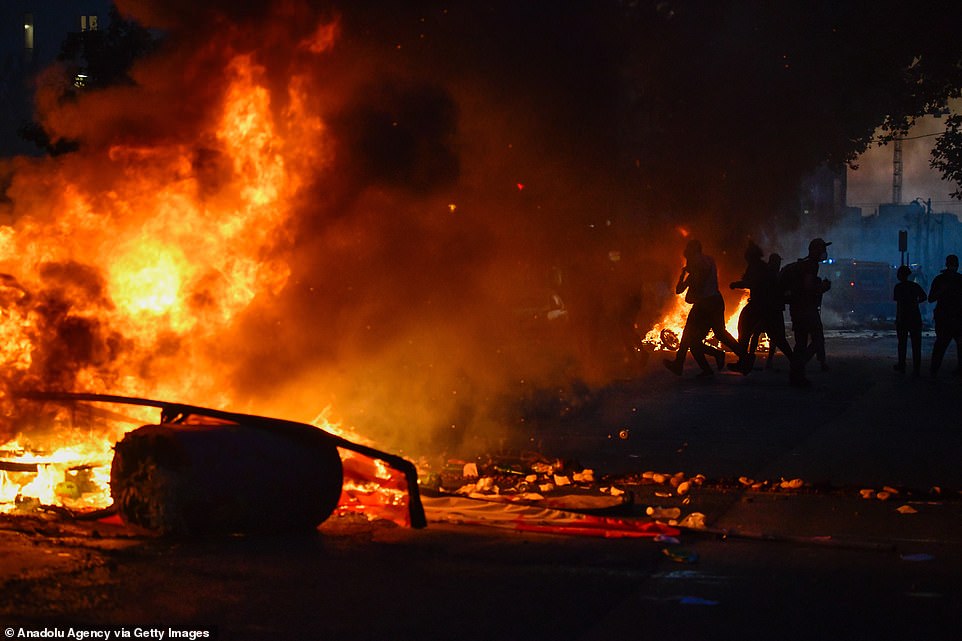 'Gangs are getting on to the road and stopping the traffic too,' said a demonstrator at the scene. 'The fires are huge - it's getting very ugly indeed.'