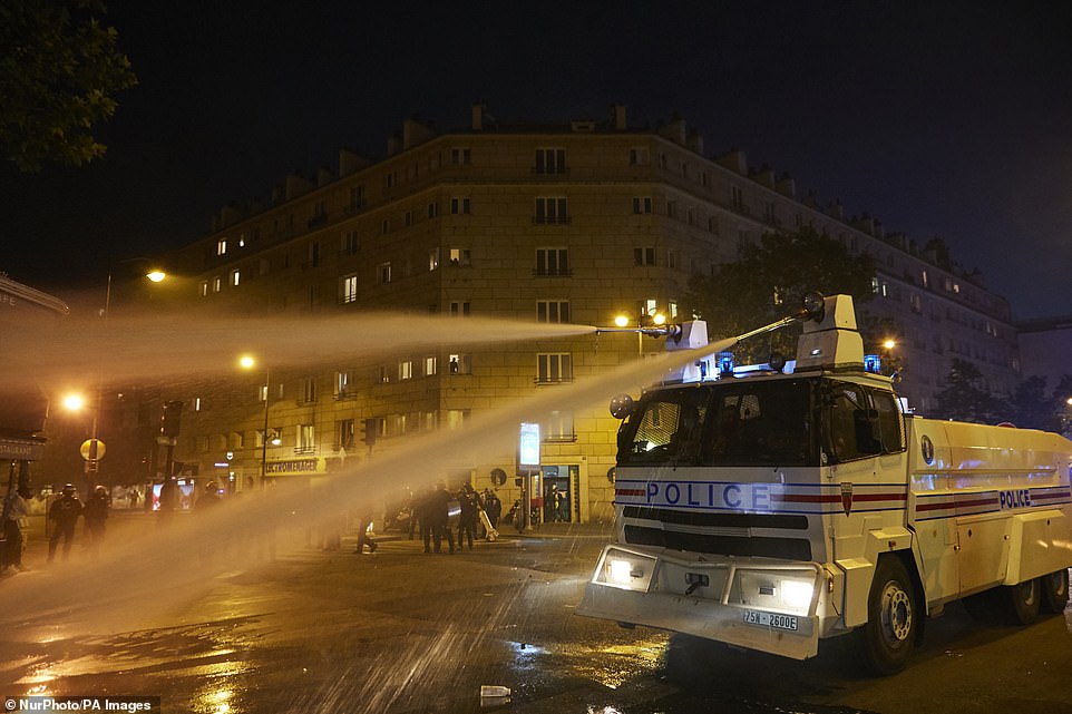A water cannon extinguishes a fire after clashes erupt following the intervention of security forces in a protest against police brutality at the 'Tribunal de Paris' courthouse